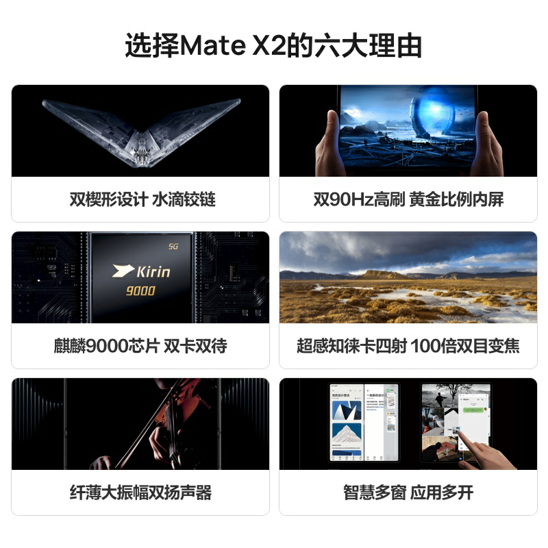 規(guī)格參數(shù) 拍照功能 后置攝像頭 ?5000萬像素超感知攝像頭+ 1600萬像素超廣角攝像頭+ 1200萬像素長焦攝像頭+800萬像素超級變焦攝像頭 攝像頭類型 ?后置四攝+前置單攝 顯示 分辨率 ?內(nèi)屏:2480 x 2200 像素 外屏:2700 x 1160 像素 備注:該分辨率對應(yīng)標準矩形,實際屏幕有效像素略少。 屏幕尺寸 ?8英寸 網(wǎng)絡(luò) 網(wǎng)絡(luò)類型 ?5G全網(wǎng)通 網(wǎng)絡(luò)模式 ?雙卡雙待 機身詳情 款式 ?雙屏 存儲 存儲容量 ?8+256GB?8+512GB?12+512GB 典藏版 基本參數(shù) 品牌 ?Huawei/華為 華為型號 ?mate x2 CPU核心數(shù) ?八核 機身顏色 ?釉白色?冰晶藍?冰晶粉?墨黑?錦白?瑞紅?亮黑色 手機類型 ?5G折疊屏智能手機?智能手機 CPU品牌 ?華為