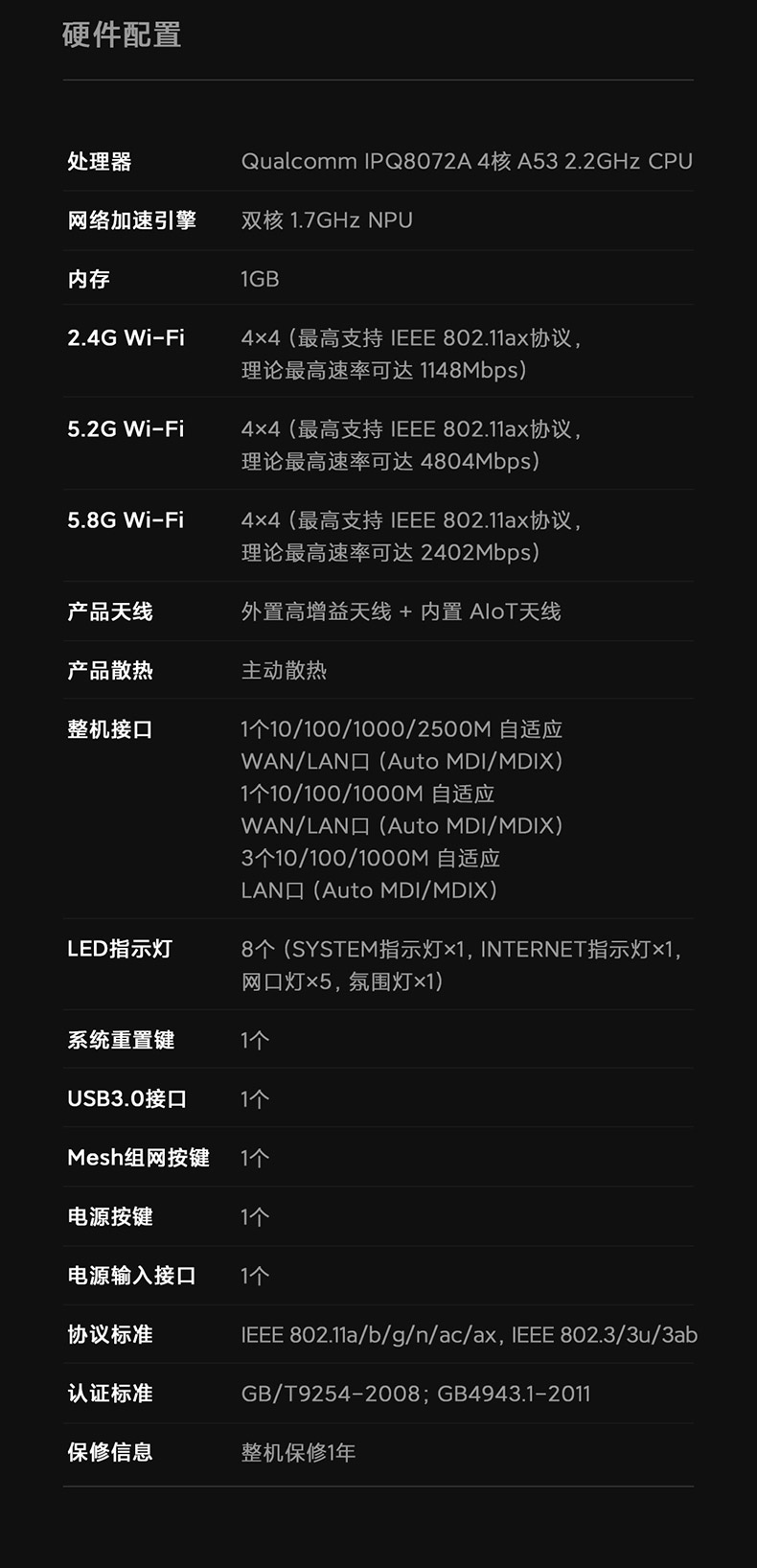 規(guī)格參數(shù) 其他屬性 網(wǎng)絡(luò)標(biāo)準(zhǔn) wifi6 有線傳輸率 千兆端口 無線傳輸速率 9000M 無線網(wǎng)絡(luò)支持頻率 2.4G&5G 適用對(duì)象 大戶型 專業(yè)游戲路由 基本參數(shù) 顏色分類 黑色 配置參數(shù) 是否無線 是 無線傳輸速度 5400M