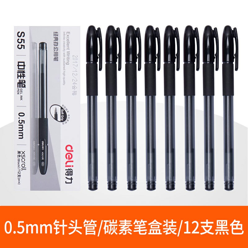 12支黑色-得力文具中性筆學(xué)生用黑色0.5mm子彈頭水筆藍(lán)紅簽字筆批改筆記賬筆辦公用品書寫工具碳素筆50/12支裝
