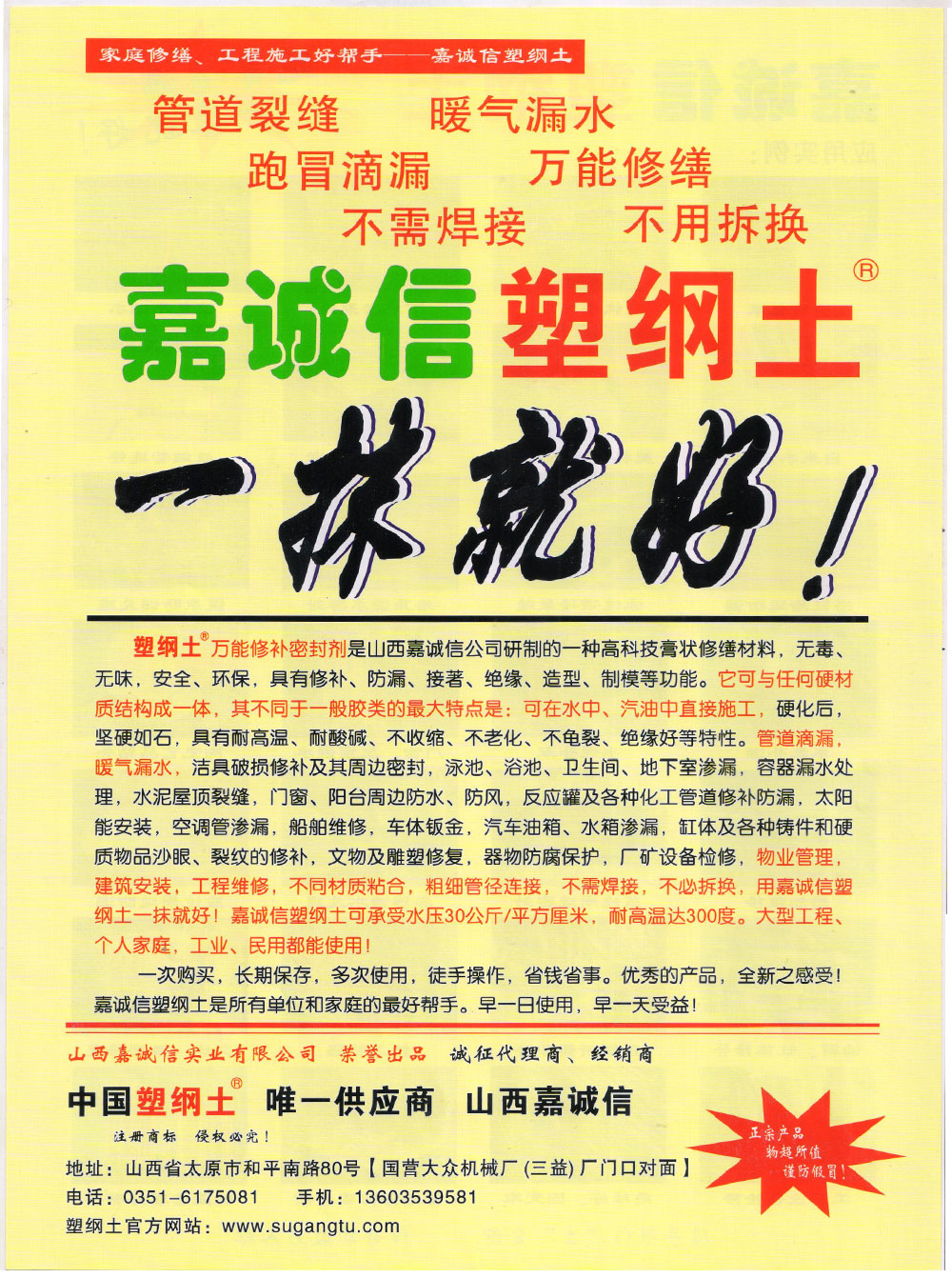 山西嘉誠信實(shí)業(yè)有限公司多年來,一直致力于“塑綱土”(國家注冊商標(biāo))修補(bǔ)密封劑在我國的推廣、應(yīng)用和研究,用戶遍布各地。長期以來,山西嘉誠信實(shí)業(yè)有限公司投入大量人力、物力和財(cái)力,通過各種媒體及其它方式對”塑綱土”品牌進(jìn)行市場推廣和大力宣傳,使“塑綱土”品牌在業(yè)內(nèi)享有相當(dāng)知名度和影響力,深受廣大用戶的青睞和厚愛。