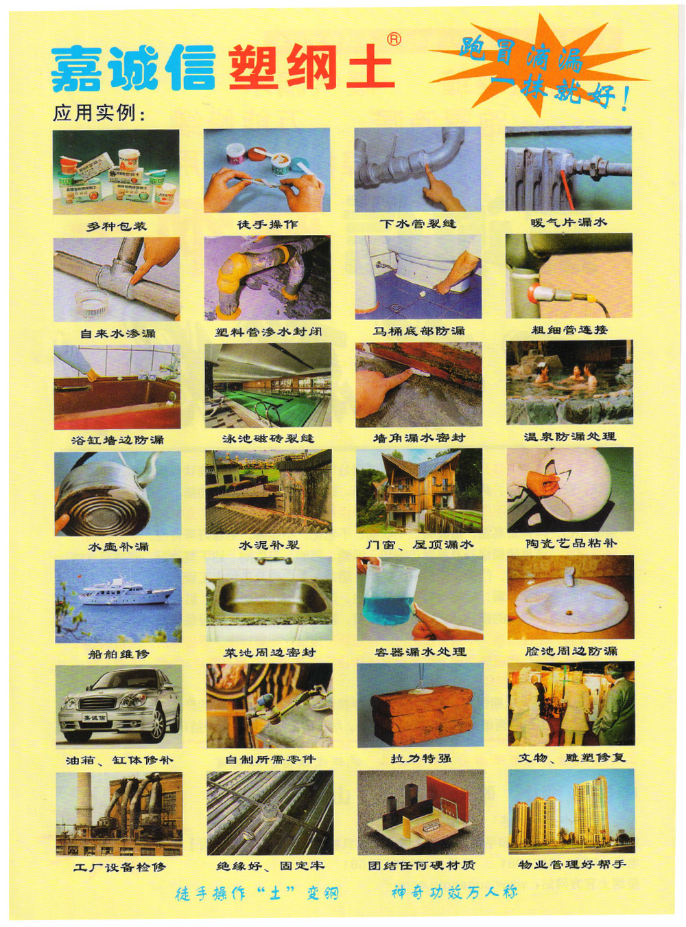 山西嘉誠信實(shí)業(yè)有限公司多年來一直致力于塑鋼土的研究、開發(fā),為塑鋼土在我國的推廣、應(yīng)用與普及立下了汗馬功勞!嘉誠信早已成了塑鋼土的代名詞,嘉誠信就是塑鋼土,塑鋼土就是嘉誠信。跑冒滴漏滲就找嘉誠信,要買塑鋼土還找嘉誠信,已成為廣大用戶的共識!